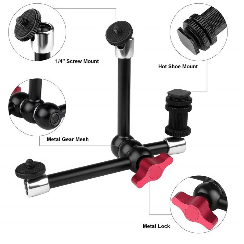 Festeanordningen er laget av aluminiumslegering og rustfritt stål og har en sterk og holdbar konstruksjon med et metallgirdesign for sikrere plassering. 360-graders justering på alle ledd gjør det enklere å finjustere vinkler, mens blitsfeste og 1/4" monteringsstøtte gir bred kompatibilitet med speilreflekskameraer og tilhørende tilbehør. Røde hurtiglåsehåndtak gjør det mulig å sette opp og flytte på plasseringer raskt uten verktøy, noe som bidrar til å effektivisere arbeidsflyten under opptak.