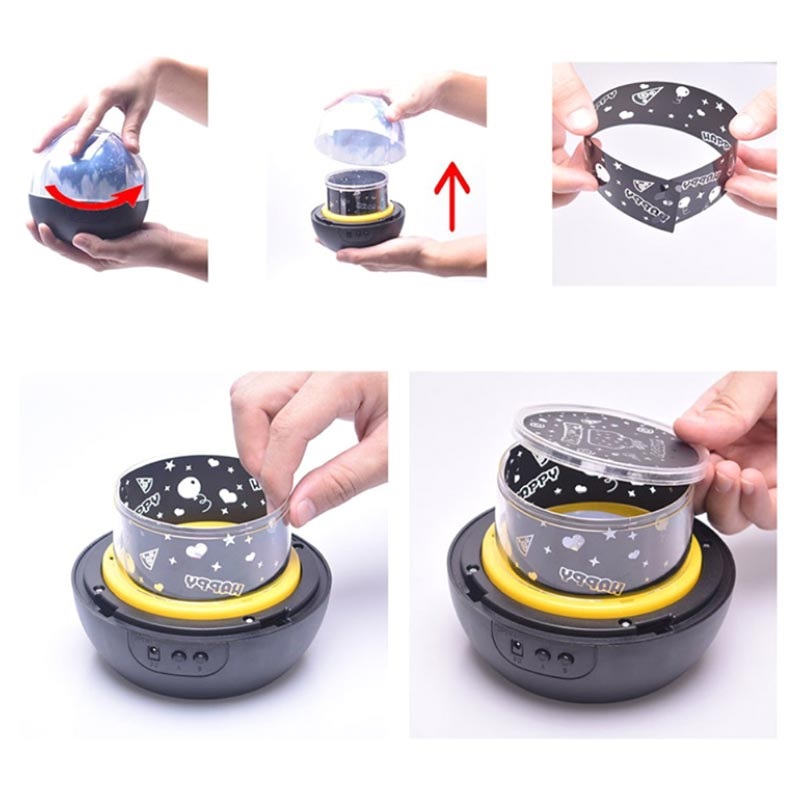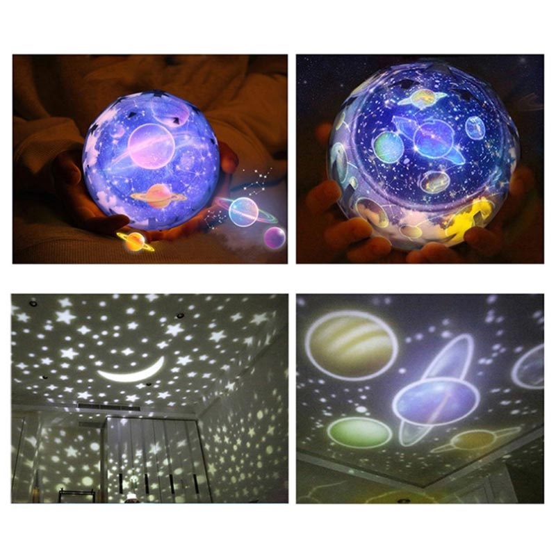 Utforsk universet med barna dine og lys opp rommet deres med denne utrolige LED-projektoren. Denne praktiske LED-projektoren / nattlampen projiserer fantastiske bilder på vegger og tak med 360-graders installasjon. Du kan velge mellom fem forskjellige projeksjonsfilmer: univers, stjernebilde, stjerner og måne, livet i havet og fest. Du kan også stille inn en av seks fargemodus og skape en vakker, romantisk atmosfære i hjemmet ditt. Når du fjerner projeksjonsfilmen, kan projektoren brukes som nattlampe.