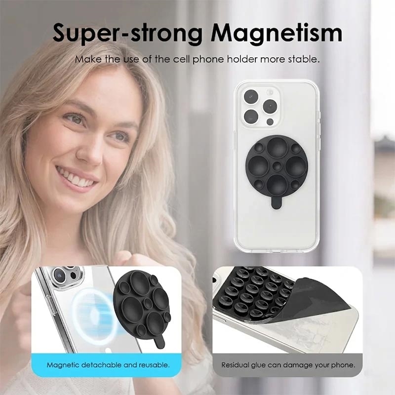 Den er laget av myk silikon og gir en behagelig følelse, godt grep og pålitelig holdbarhet for daglig bruk. Den kraftige magnetiske utformingen hjelper med å holde MagSafe-kompatible telefoner på plass, mens sugekoppbasen skaper et stabilt håndfritt oppsett for ulike situasjoner hjemme eller på farten. Den er lett og enkel å bære, og er et praktisk tilbehør for brukere som ønsker rask telefonstøtte uten klumpete holdere eller komplisert installasjon.