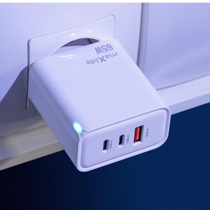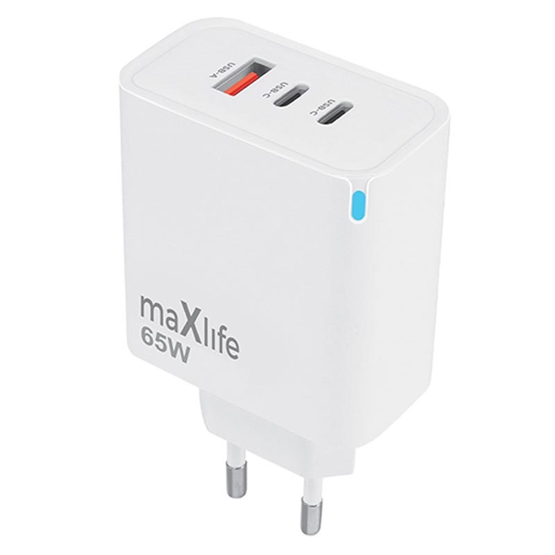 Maxlife MXTC-09-65ACC GaN-lader - 65 W hurtigladeadapter med 2 x USB-C PD- og 1 x USB-A QC-porter