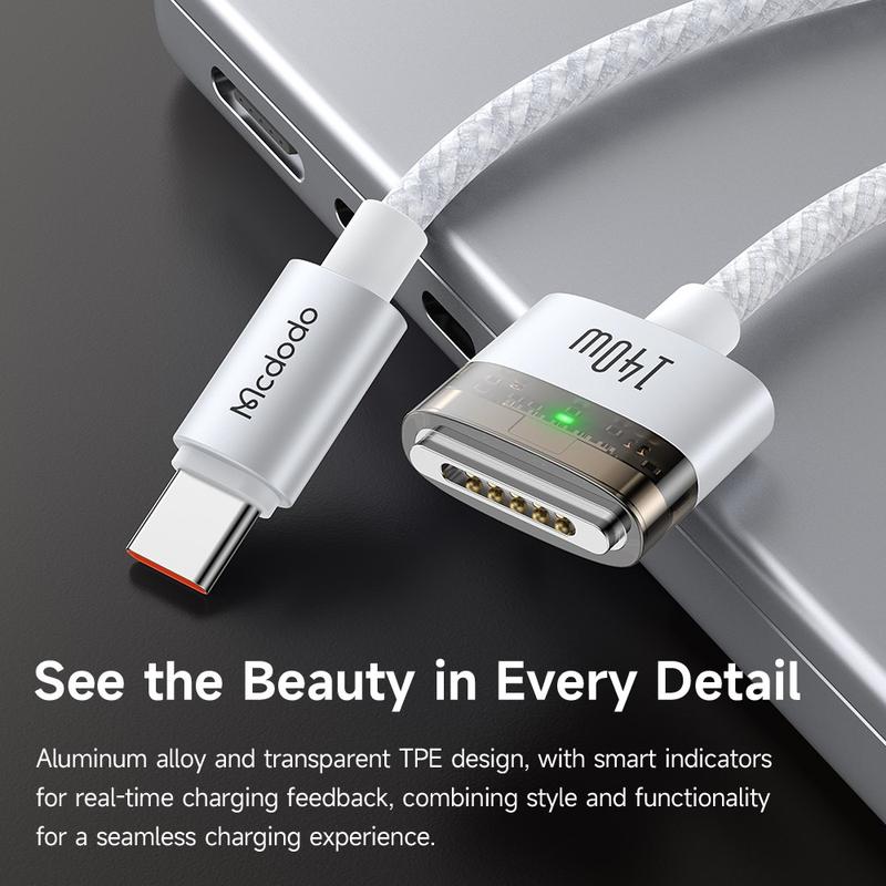 Lad enhetene dine raskere og smartere med MCDODO CA-207. Denne kabelen har støtte for 140W strømforsyning og er utformet for å gi jevn og effektiv lading til Apple-enheter, inkludert MacBooks og iPhones, med ekstra bekvemmelighet i form av magnetisk justering for umiddelbar tilkobling.