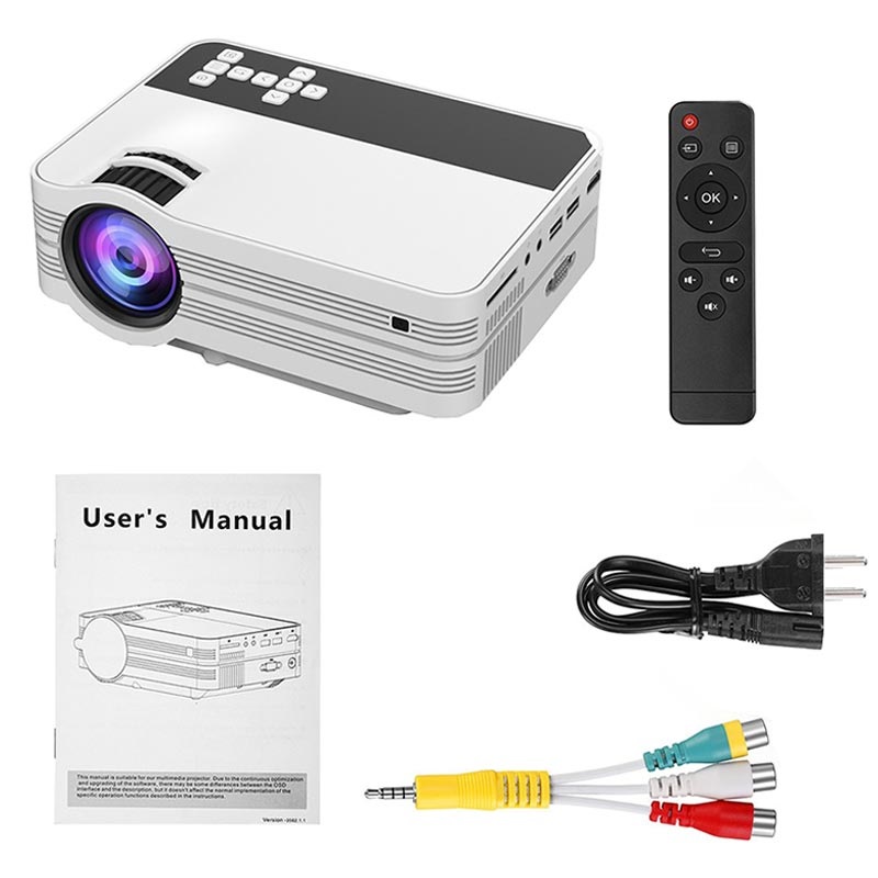 The UB-10 LED projector features a brightness of up to 2000 Lumens that reveal amazing pictures with deep colors and clarity. The minimal projecting distance of the mini portable LED projector UB-10 is 150cm, and the maximal is 520cm. Depends on the projecting distance image size varies from 35" to 176". Designed with buttons for controlling, or you can use the included remote for easy operation. Manually adjust the picture using the focus wheel and correct image distortion using the keystone wheel.