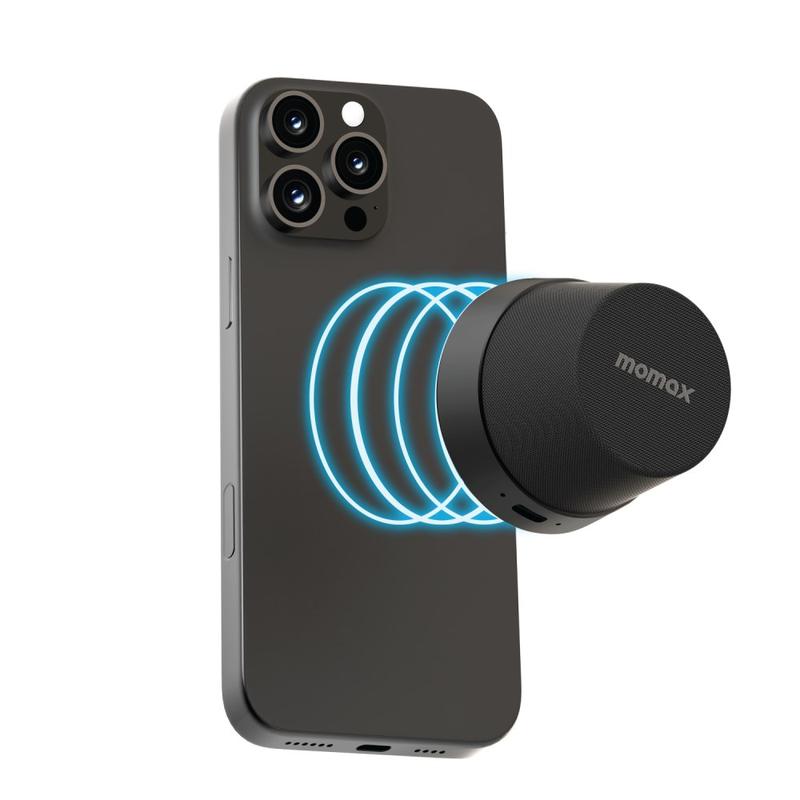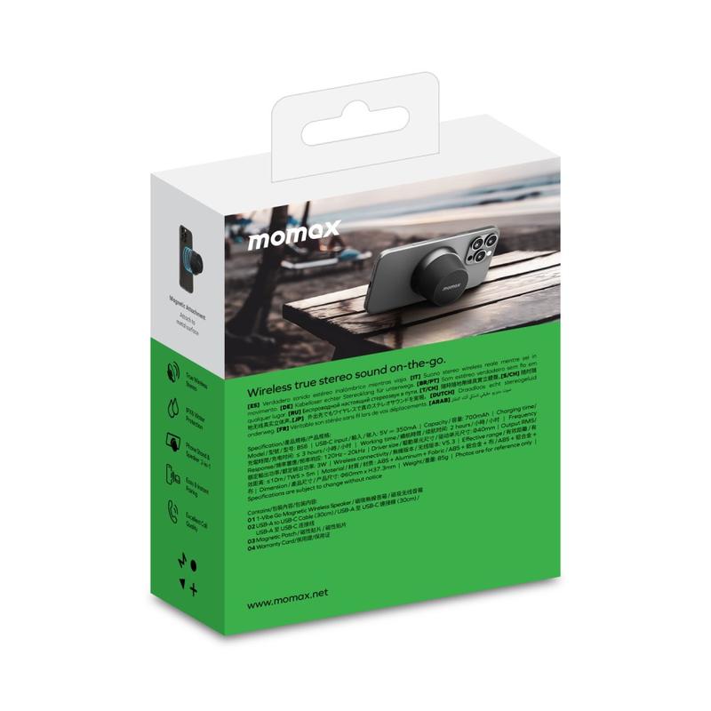 MOMAX 1-Vibe Go BS6 magnetisk mini Bluetooth-høyttaler er en kompakt, allsidig lydløsning designet for daglig underholdning hjemme eller på farten. Den ultrakompakte magnetiske designen kombinerer en bærbar trådløs høyttaler med en praktisk telefonstativ, slik at du enkelt kan nyte musikk, videoer og samtaler. Den er utstyrt med en kraftig 40 mm driver og 360° lydutgang, og leverer oppslukende lyd i en overraskende liten form, mens IPX6-vanntetthet gjør den egnet for daglig bruk i forskjellige miljøer.