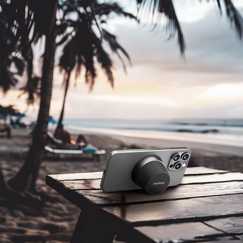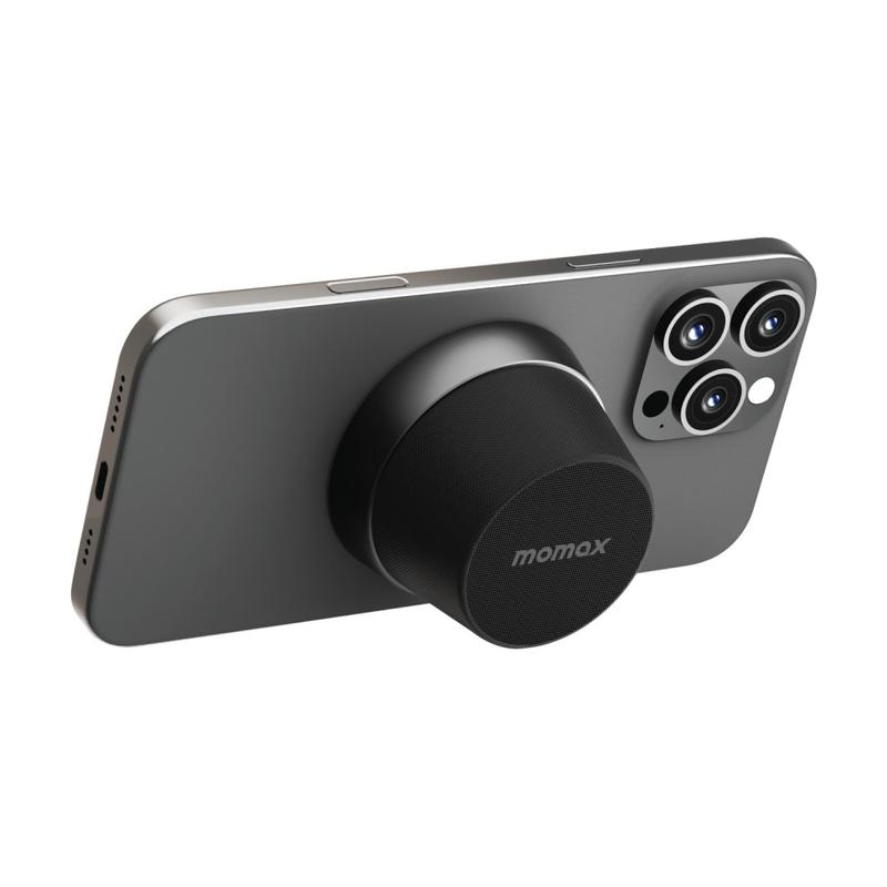 Momax 1-Vibe Go BS6 magnetisk mini Bluetooth-høyttaler og telefonstativ, 360° lyd og IPX6 vanntett