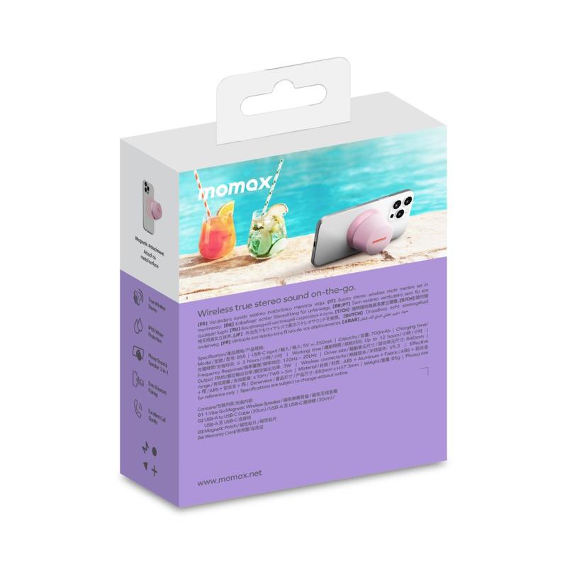 Momax 1-Vibe Go BS6 magnetisk mini Bluetooth-høyttaler og telefonstativ, 360° lyd og IPX6 vanntett