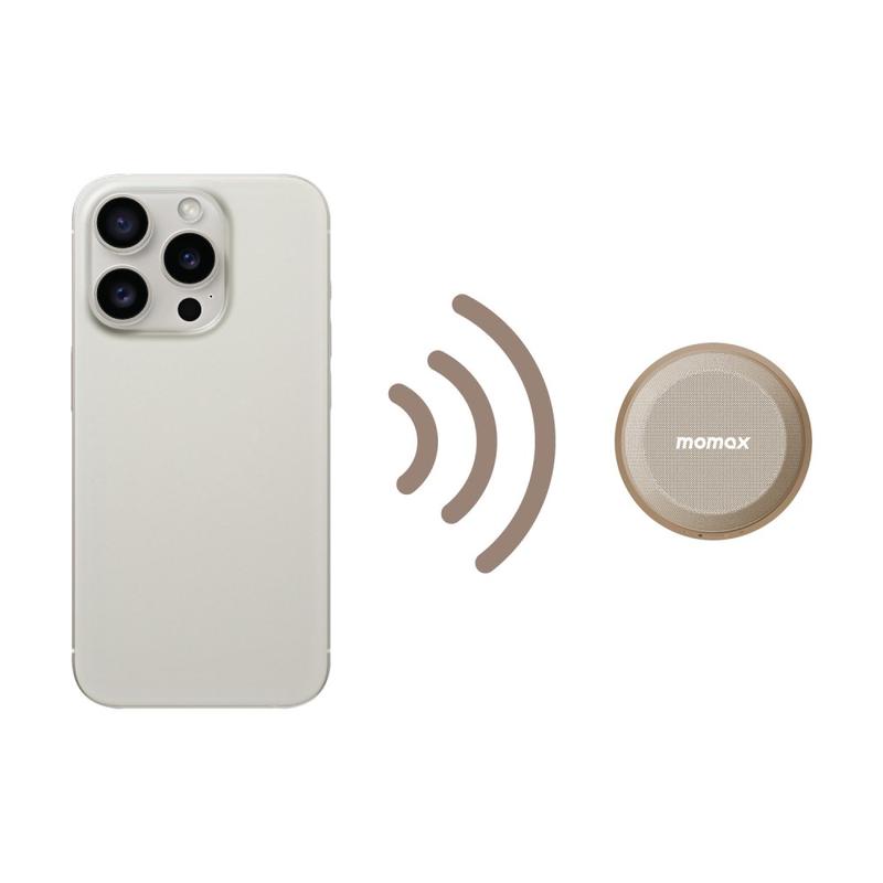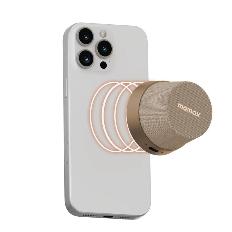 Momax 1-Vibe Go BS6 magnetisk mini Bluetooth-høyttaler og telefonstativ, 360° lyd og IPX6 vanntett