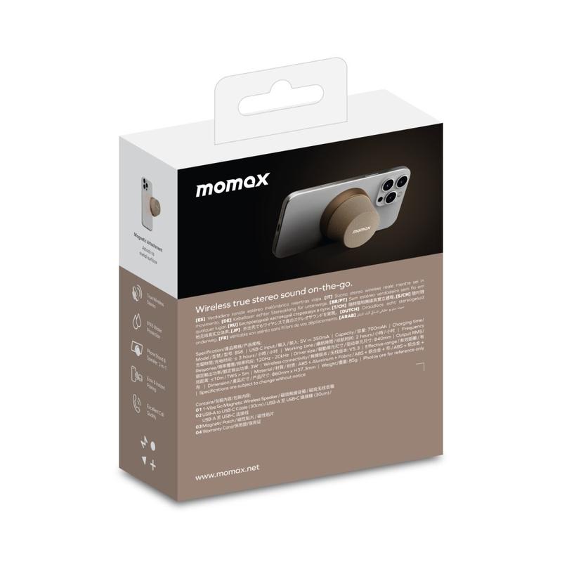 MOMAX 1-Vibe Go BS6 magnetisk mini Bluetooth-høyttaler er en kompakt, allsidig lydløsning designet for daglig underholdning hjemme eller på farten. Den ultrakompakte magnetiske designen kombinerer en bærbar trådløs høyttaler med en praktisk telefonstativ, slik at du enkelt kan nyte musikk, videoer og samtaler. Den er utstyrt med en kraftig 40 mm driver og 360° lydutgang, og leverer oppslukende lyd i en overraskende liten form, mens IPX6-vanntetthet gjør den egnet for daglig bruk i forskjellige miljøer.