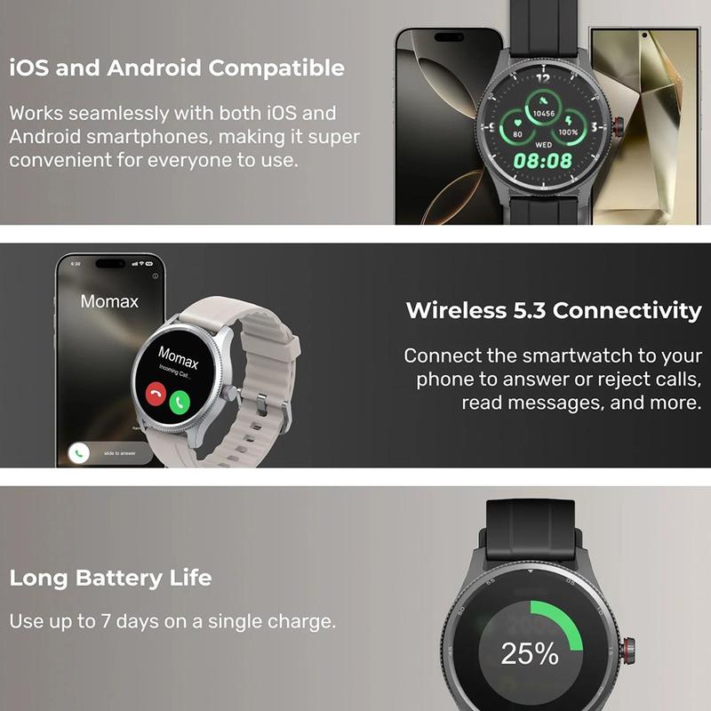 Hold oversikt over dagen din med MOMAX 1-Wear Smart Watch - en sporty, stilig smartklokke laget for daglig helsesporing og aktive rutiner. Den overvåker hjertefrekvens, SpO2 (blodoksygen) og stress, tilbyr AI-drevet søvnanalyse (inkludert dyp søvn og REM) og sporer treningsøkter med over 100 sportsmoduser. Den runde TFT-berøringsskjermen på 1,38 tommer er lys, enkel å navigere og kan tilpasses med flere urskiver - slik at den ser like bra ut på jobben som under trening. Med IP68-vanntetthet, Wireless 5.3-tilkobling og opptil 7 dagers batterilevetid er den designet for bekvemmelighet fra morgen til kveld.