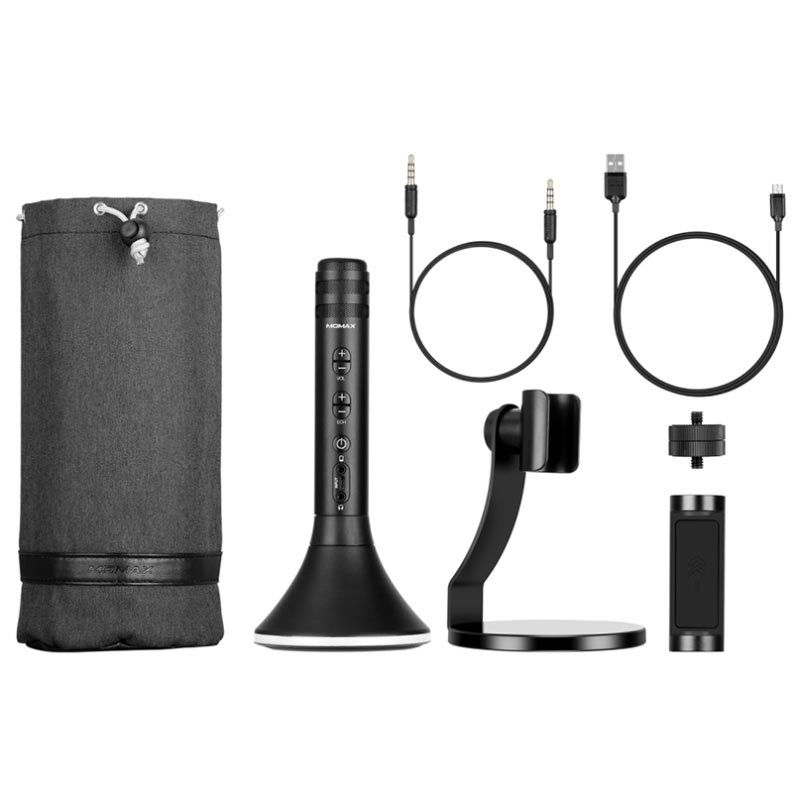 Hold den beste fest noensinne og la alle gjester være karaoke-stjerner med denne fantastiske trådløse mikrofonen fra Momax. Momax Kmic Pro er laget av førsteklasses aluminium, og er dekket med et profesjonelt metall-nett som reduserer støy og leverer en fantastisk lyd med kraftig KTV-effekt. Med knappene på mikrofonen kan du styre volumet og den smarte ekko-funksjonen. Den kan enkelt kobles med smarttelefonen via Bluetooth og er klar til bruk. I tillegg kan Kmic Pro kobles til enheten din via 3,5 mm kabel så du kan lytte til din musikk takket være den integrerte Bluetooth-høyttaleren. Settet inkluderer et kreativt stativ som holder Kmic Pro og en praktisk telefonholder som gir flere synsvinkler mens de synger. En ekstra funksjon er den innebygde fargerike LED-lys som blinker i takt med musikken og er perfekt for fest.