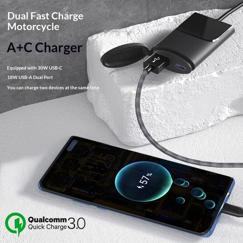 Med en 30W USB-C PD-port og en 18W USB-A-port støtter denne laderen hurtiglading for et bredt utvalg av enheter og lar deg lade to enheter samtidig. Den vanntette IP67-konstruksjonen og den innebygde sikkerhetsbeskyttelsen gjør den til et pålitelig valg for daglig kjøring og utendørs bruk under skiftende værforhold.