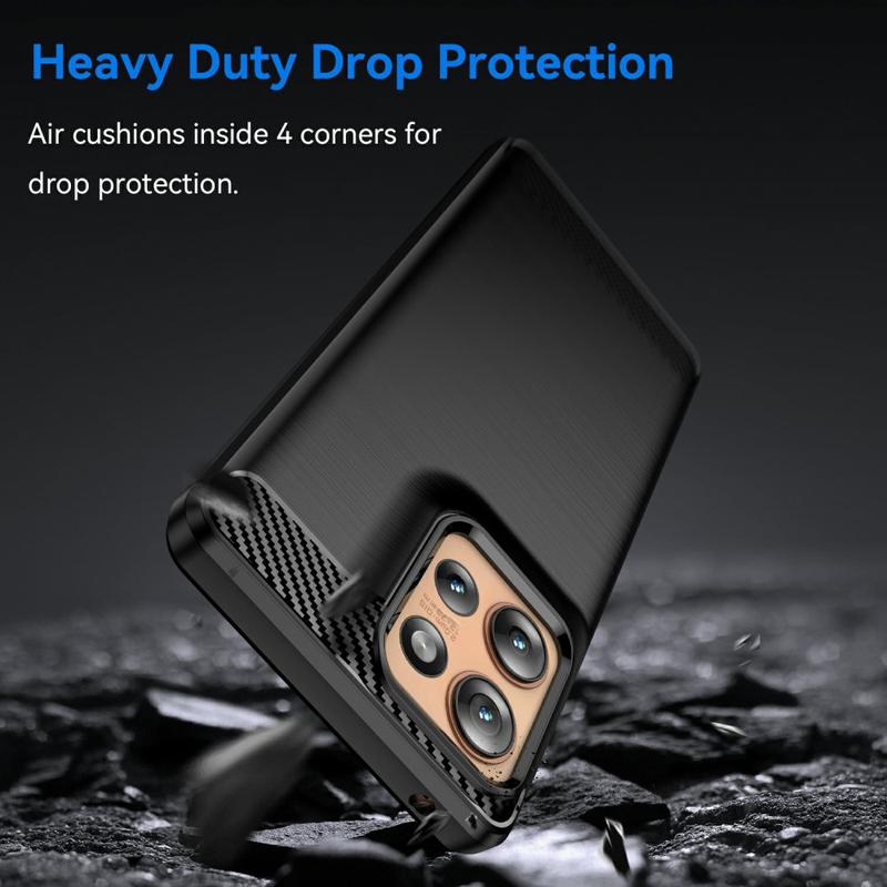 Det børstede TPU-dekselet beskytter din Motorola Edge 50 tilstrekkelig, samtidig som det gir den en flott stil, takket være karbonfibermønsteret på baksiden. Dekselet sikrer også overoppheting når du bruker Motorola Edge 50, med sitt varmespredningsdesign.
