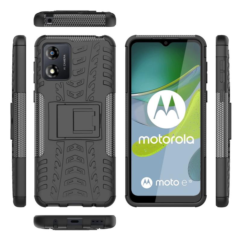 - Et kraftig hybrid-deksel med stativ til Motorola Moto E13
