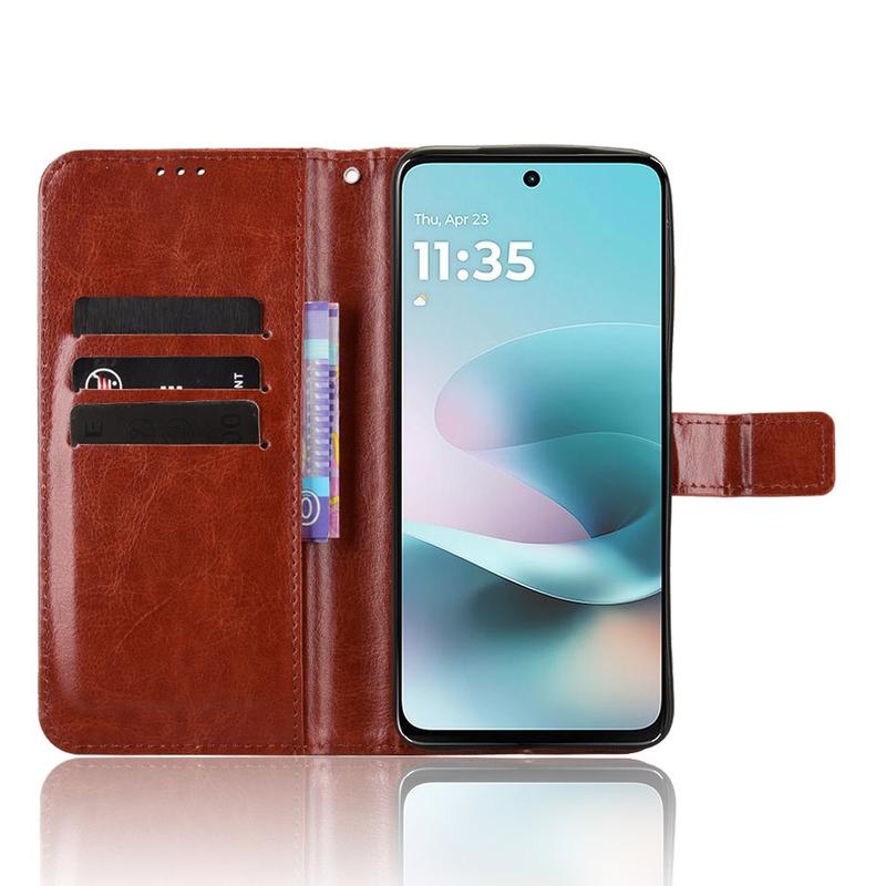 Gi din nye Motorola Moto G67 Power, Moto G57 Power, Moto G57 et raffinert vintageutseende samtidig som den erstatter hverdagslommeboken din. Eksteriøret i polyuretan med Crazy Horse-tekstur kombineres med et støtdempende TPU-skall for å beskytte mot fall og riper, mens smarte lommer holder orden på kort og kontanter.