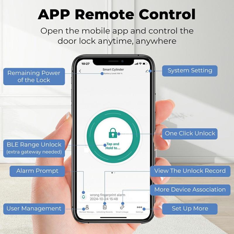 Denne smarte låsecylinderen støtter 5 forskjellige låsemetoder, noe som gjør det enklere å velge det alternativet som passer best til din hverdag. Du kan låse opp døren via appen, fingeravtrykkgjenkjenning, passordinntasting, IC-kort eller tradisjonell nøkkel. Denne fleksibiliteten er spesielt nyttig for husholdninger med flere brukere, gjestetilgang, kontormiljøer eller alle som ønsker et mer praktisk alternativ til å bære nøkler hele tiden.