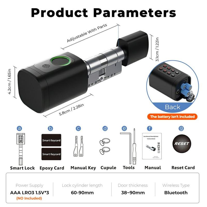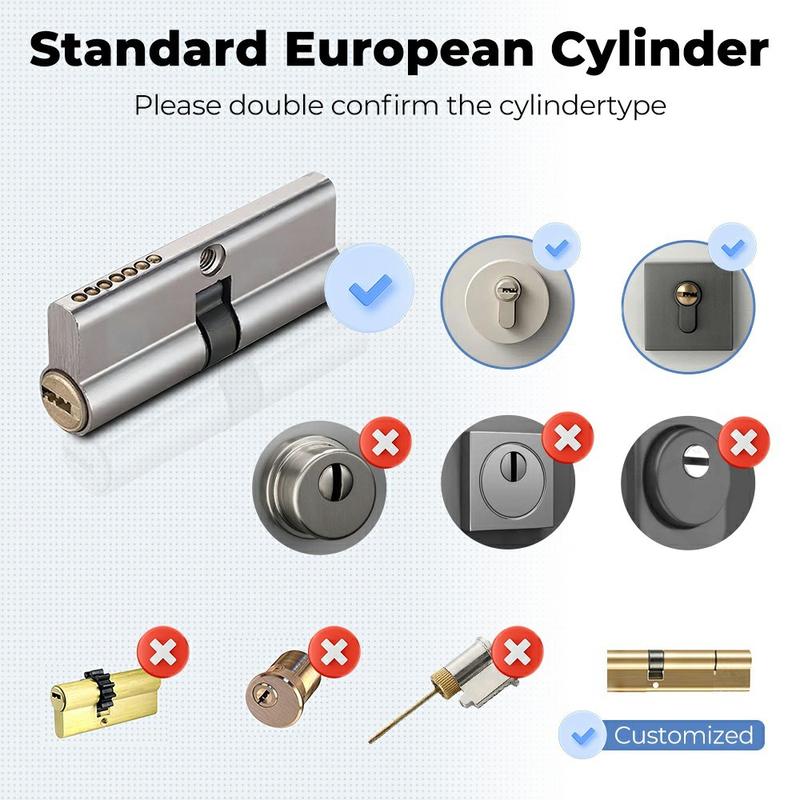Denne smarte låsecylinderen er designet for enkel utskifting av en eksisterende låsekjerne uten å endre dørkonstruksjonen. Den justerbare sylinderen på 60-90 mm forbedrer kompatibiliteten med forskjellige dørtykkelser og vanlige europeiske låsestørrelser. Installasjonen er enkel og kan fullføres raskt, noe som gjør den til en praktisk oppgradering for brukere som ønsker et smartere låsesystem uten mer kompliserte endringer på døren.