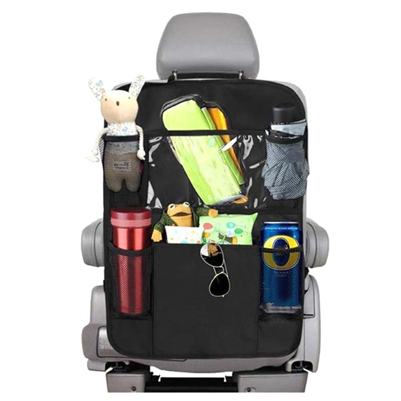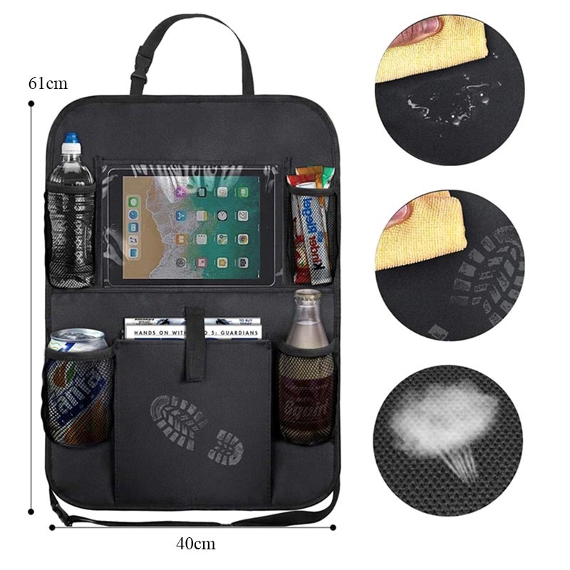 Hold baksetet passasjerenes drinker, snacks, penner og iPad eller nettbrett organisert med denne bilarrangørposen. Baksetebilarrangøren inneholder fem lommer for snacks og drikkevarer og en gjennomsiktig og berøringsstøttelomme for en iPad eller nettbrett. Sparkematten er laget av miljøvennlig og vannavvisende Oxford-materiale, lett å rengjøre. Takket være de justerbare stroppene og spennene er arrangøren egnet for de fleste biler, SUV-er, varebiler og lastebiler.