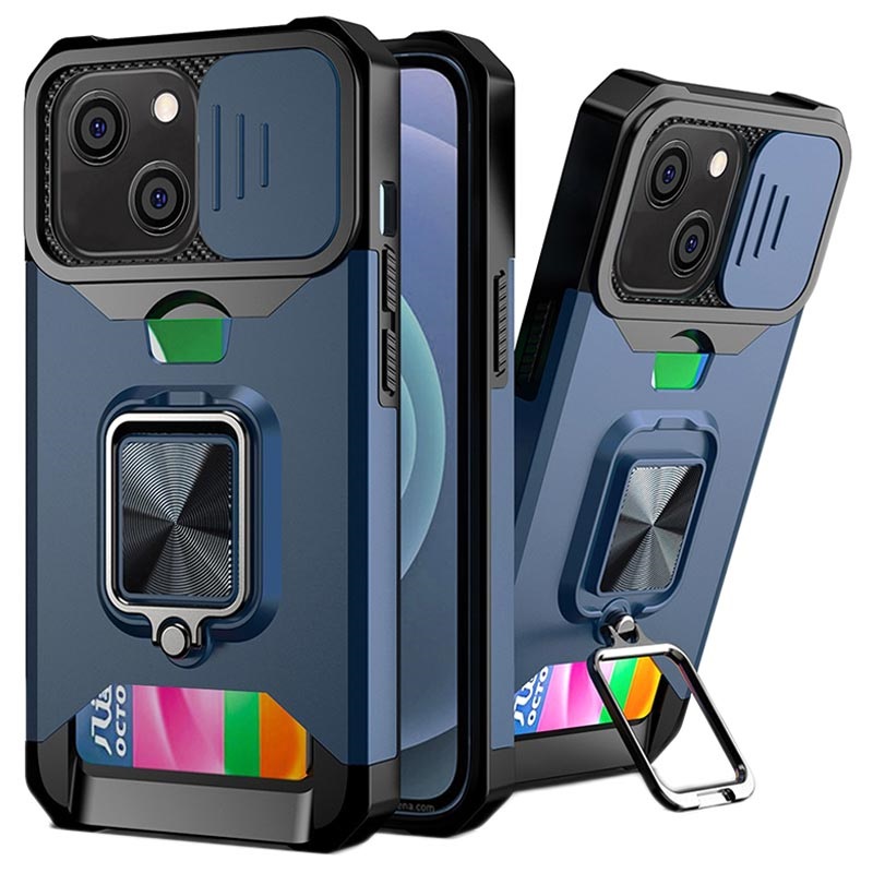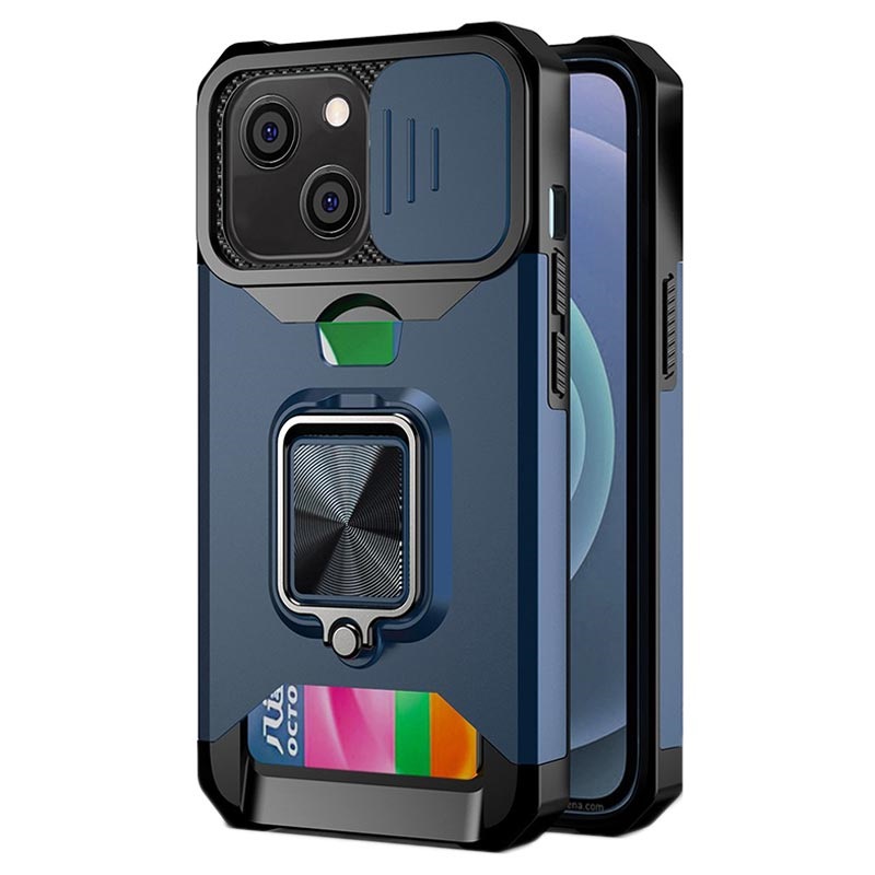 Multifunksjonell 4-i-1 Hybrid-deksel til iPhone 13 med Kortholder, Magnetisk Ring, Stativ, Kamera Beskytter