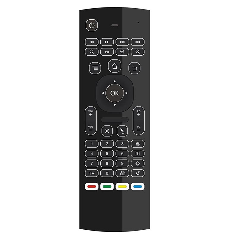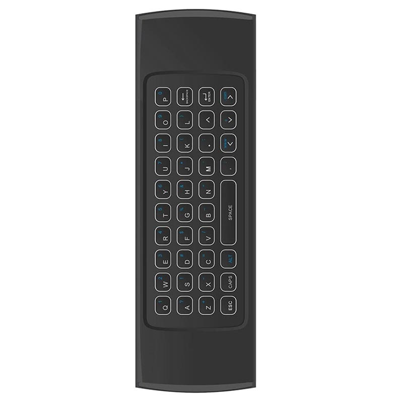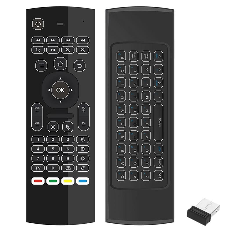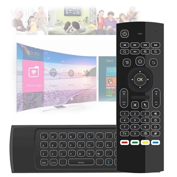 Denne multifunksjonelle 5-i-1 trådløse luftmusen har et tastatur på baksiden med 38 taster som har bakgrunnsbelysning for komfortabel skriving i mørket. Den har også en fjernkontroll med en IR-læringsfunksjon slik at du kan programmere opptil fire knapper. Den kommer med en 2,4 GHz USB-dongle og støtter Android-, Windows-, Mac OS- og Linux-systemer.