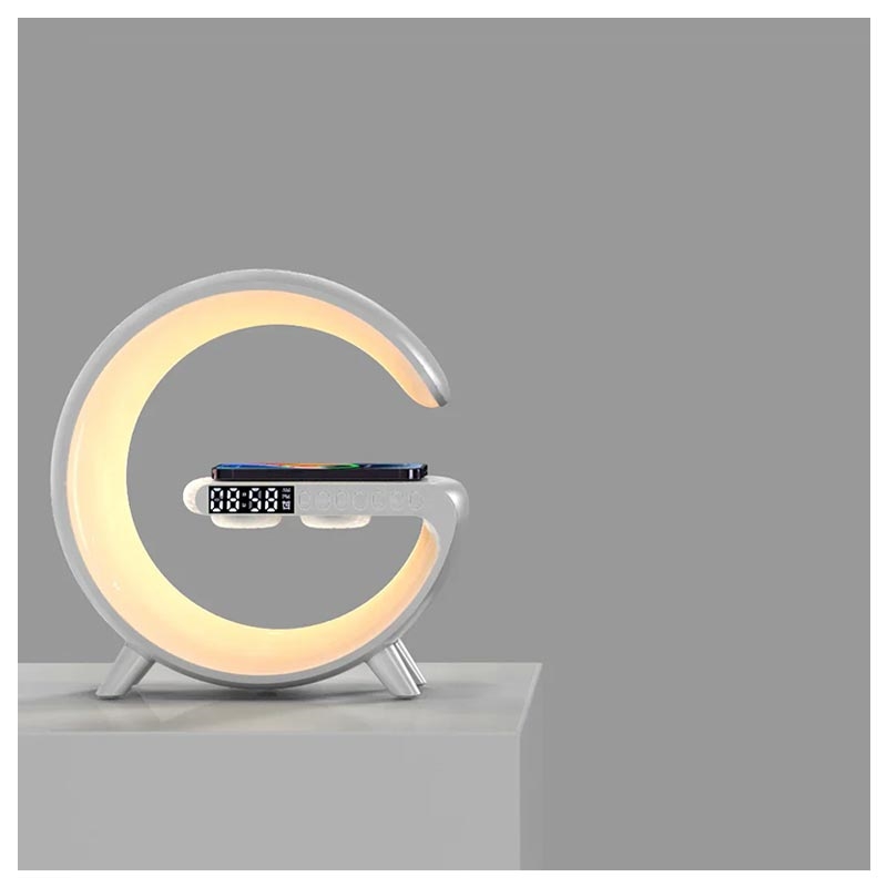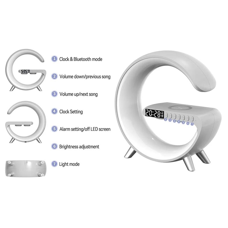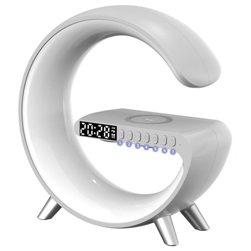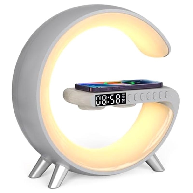Den har LED-lys, Bluetooth-høyttaler, vekkerklokke og 15 W trådløs laderfunksjon.