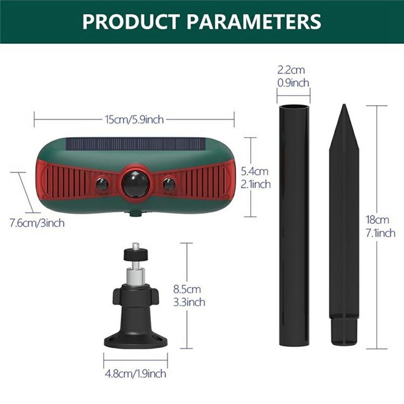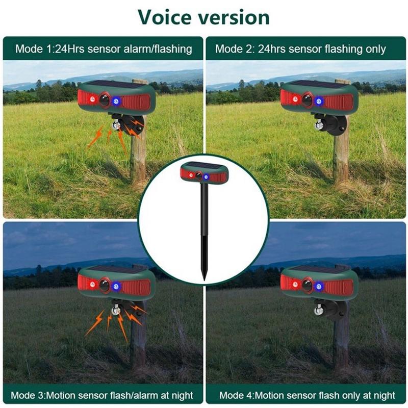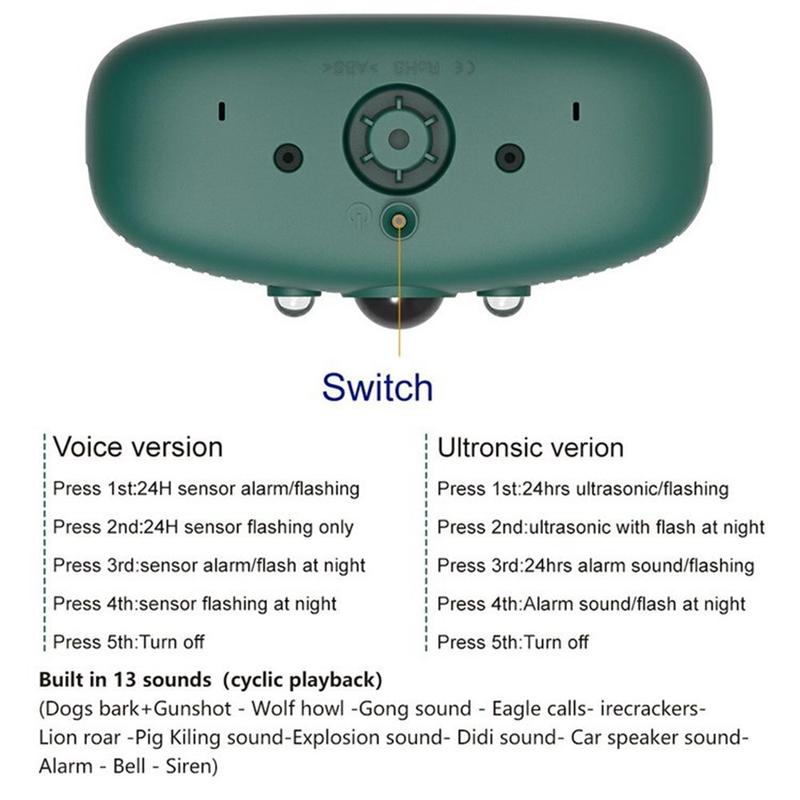 Denne enheten har 12 roterende lydeffekter, inkludert sirener, hundebjeff og skuddlignende lyder, og tilbyr en allsidig avskrekkingsløsning for å holde dyr og skadedyr borte fra eiendommen din.