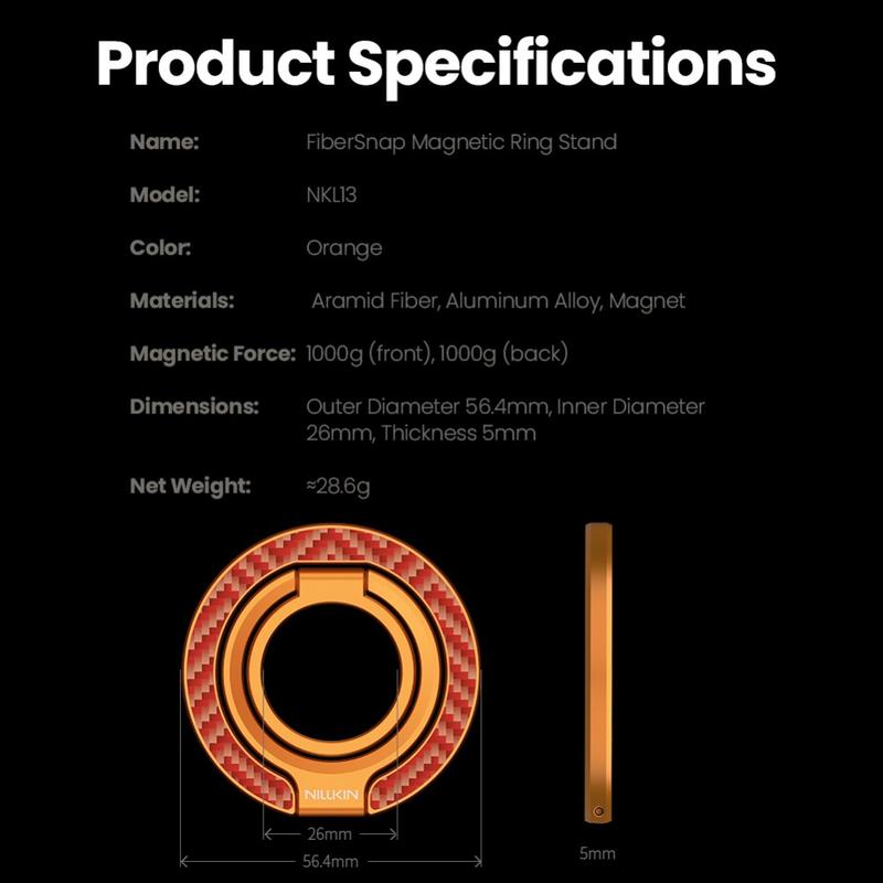 Nillkin FiberSnap Magnetic Ring Stand kombinerer førsteklasses materialer med fleksibel funksjonalitet for å løfte den daglige telefonbruken. Det er laget av lett aramidfiber og anodisert aluminium, og gir en raffinert teknisk estetikk samtidig som det gir et sikkert grep og uanstrengt håndfri visning. Den er designet for sømløs MagSafe-bruk, og tilpasser seg enkelt til jobb, reise og dagligliv uten å være i veien.