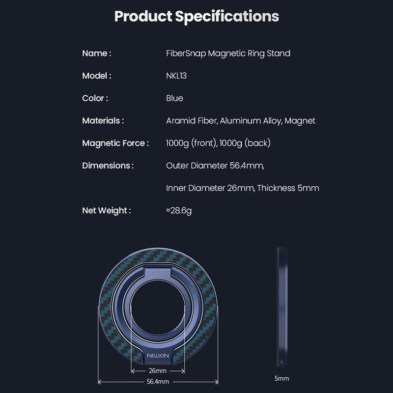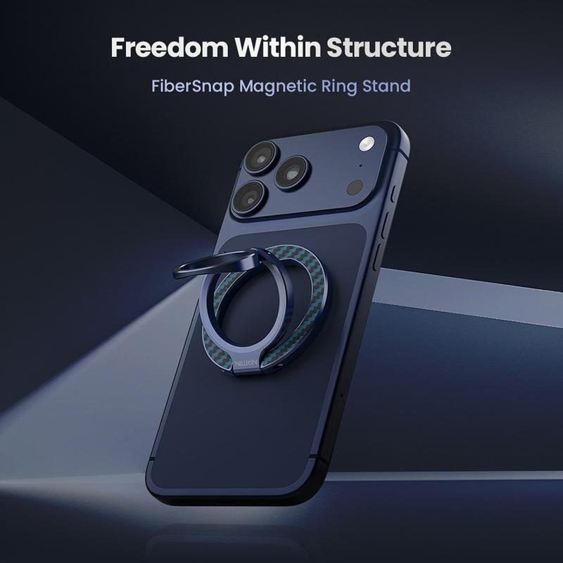 Nillkin FiberSnap Magnetic Ring Stand kombinerer førsteklasses materialer med fleksibel funksjonalitet for å løfte den daglige telefonbruken. Det er laget av lett aramidfiber og anodisert aluminium, og gir en raffinert teknisk estetikk samtidig som det gir et sikkert grep og uanstrengt håndfri visning. Den er designet for sømløs MagSafe-bruk, og tilpasser seg enkelt til jobb, reise og dagligliv uten å være i veien.