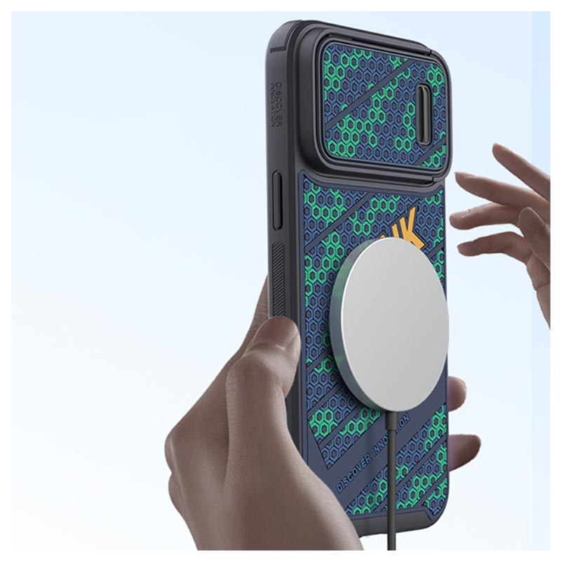 Dette tolagsdekselet med en unik 3D-bikakedesign er laget av fleksibelt, støtdempende TPU-materiale og hard plast, med et innebygd magnetisk ark som er kompatibelt med Apple MagSafe-tilbehør. I tillegg har dekselet en kameraglidebryter som fullt ut beskytter kameraet på din iPhone 14 Pro.