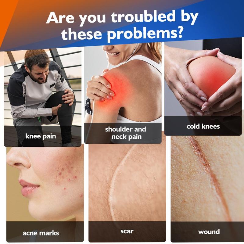 - Avansert infrarød lysterapi - Utstyrt med 44 dobbeltkjernede 660-850 nm LED-lampeperler som avgir dypt gjennomtrengende infrarødt og rødt lys for å forbedre sirkulasjonen og lindre smerter.
