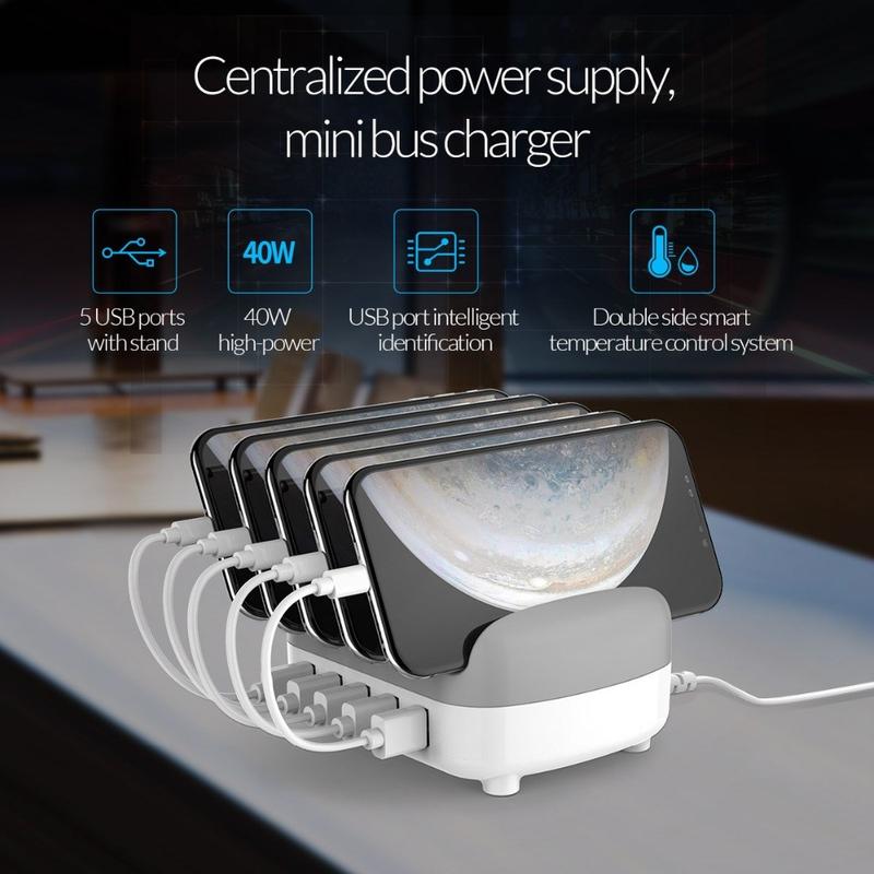 Orico DUK-5P 5-ports USB-ladestasjon, 40W, med holder for telefon og nettbrett - EU-stikkontakt