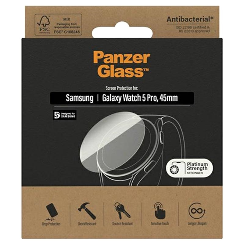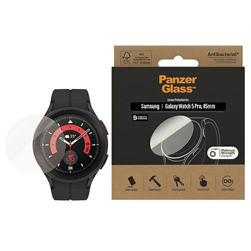 Med PanzerGlass AntiBacterial Samsung Galaxy Watch5 Pro Hærdet glas - 45mm får du ikke kun fremragende beskyttelse, men også en renere og mer hygienisk enhet. Dette produktet er en investering i både din enhets levetid og din personlige helse.