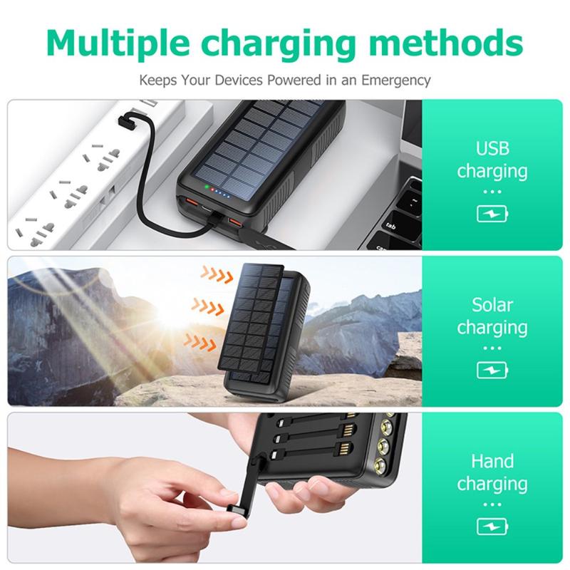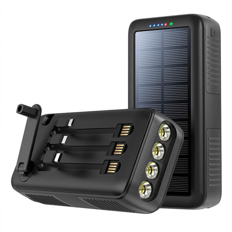 Denne alt-i-ett-strømbanken utmerker seg med allsidighet og robusthet. Enten du camper utenfor strømnettet eller opplever strømbrudd, fungerer solcellepanelet og håndsveiven som pålitelige ladestøtter. De integrerte kablene eliminerer behovet for ekstra ledninger, mens den robuste kapasiteten på 30000mAh gir deg trygghet når du er langt unna en stikkontakt. Det er en praktisk løsning for reisende, friluftsentusiaster og alle som ønsker å være forberedt.