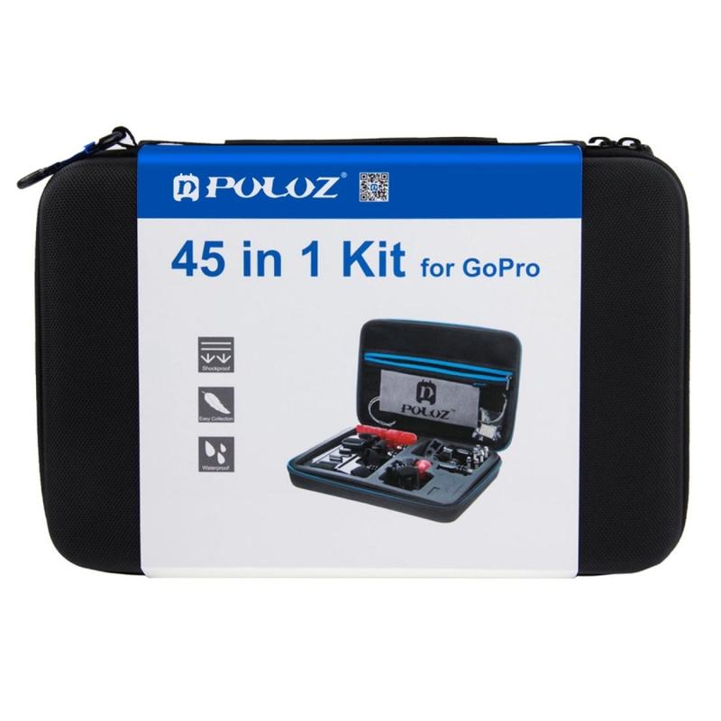 PULUZ PKT10 45-i-1 actionkamera-tilbehørssett - stor oppbevaringsveske, bryst- og hodemonteringer, flytende håndtakssett for GoPro