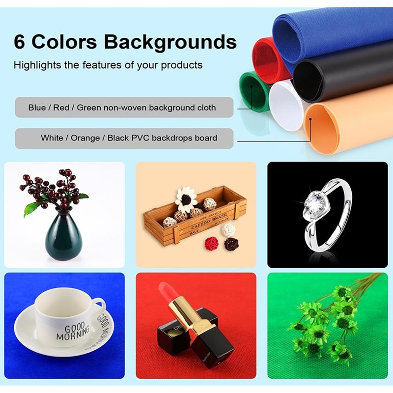 Leveres med en bæreveske og 3 stk. bakgrunnsplater (hvit, oransje, svart). Papirplatene er rynkebestandige og vannbestandige