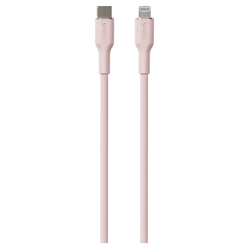 Myk kabel med USB-C- og Lightning-kontakt i myk silikon i dus rosa farge.