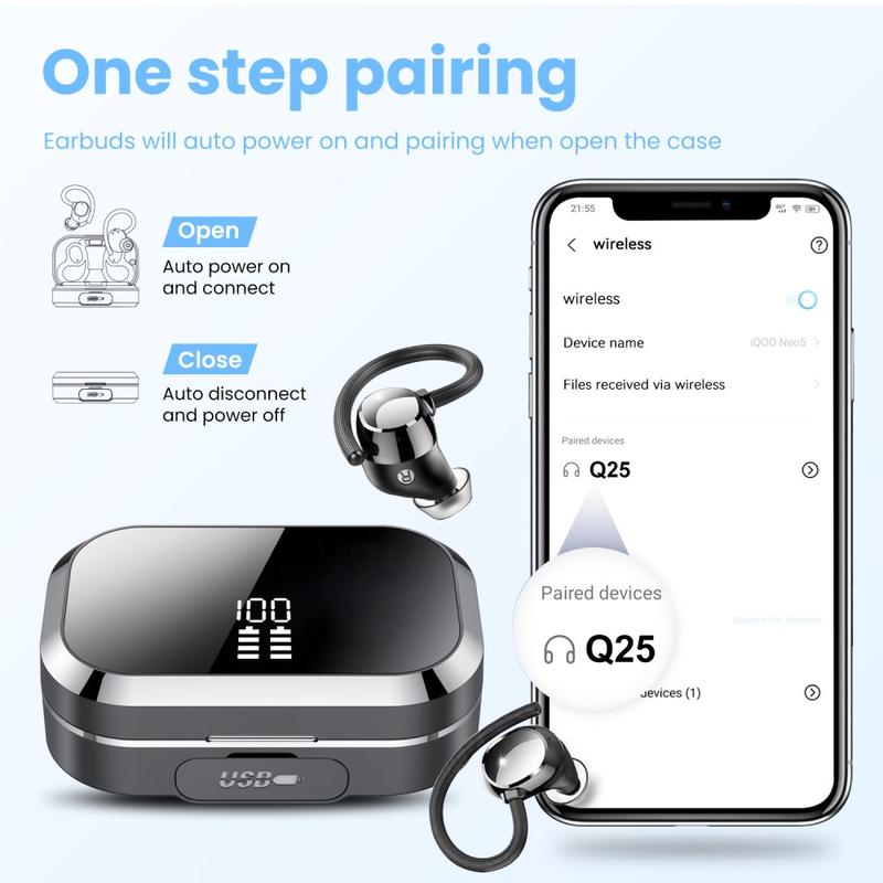 De trådløse Q25-øretelefonene er laget for brukere som ønsker en mer sikker passform, praktisk batteristøtte og fleksibel lytteopplevelse i hverdagen - alt i én kompakt enhet. Takket være den ergonomiske ørekrokdesignen sitter de komfortabelt på plass under trening, pendling, gåturer og daglig bruk, mens det medfølgende ladeetuiet gir ekstra bekvemmelighet med en innebygd powerbank-funksjon. Dette gjør Q25 til et smart valg for de som ønsker mer enn et standardpar trådløse ørepropper.