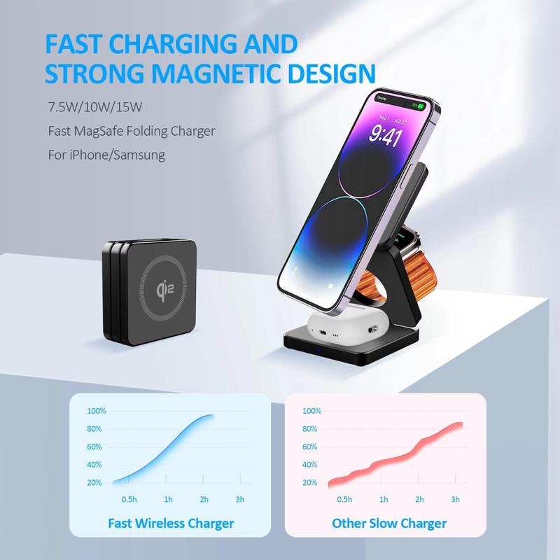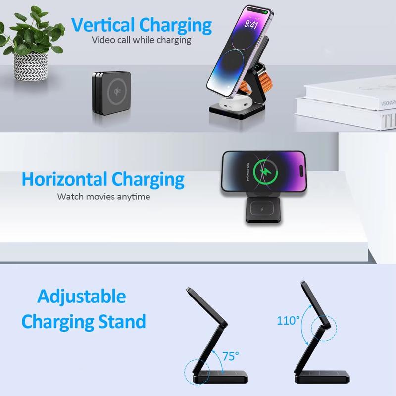 Qi2 15W 3-i-1 sammenleggbart magnetisk trådløst ladestativ - for iPhone, Apple Watch og AirPods