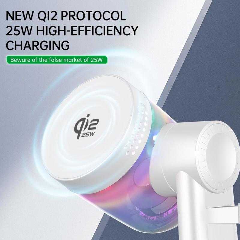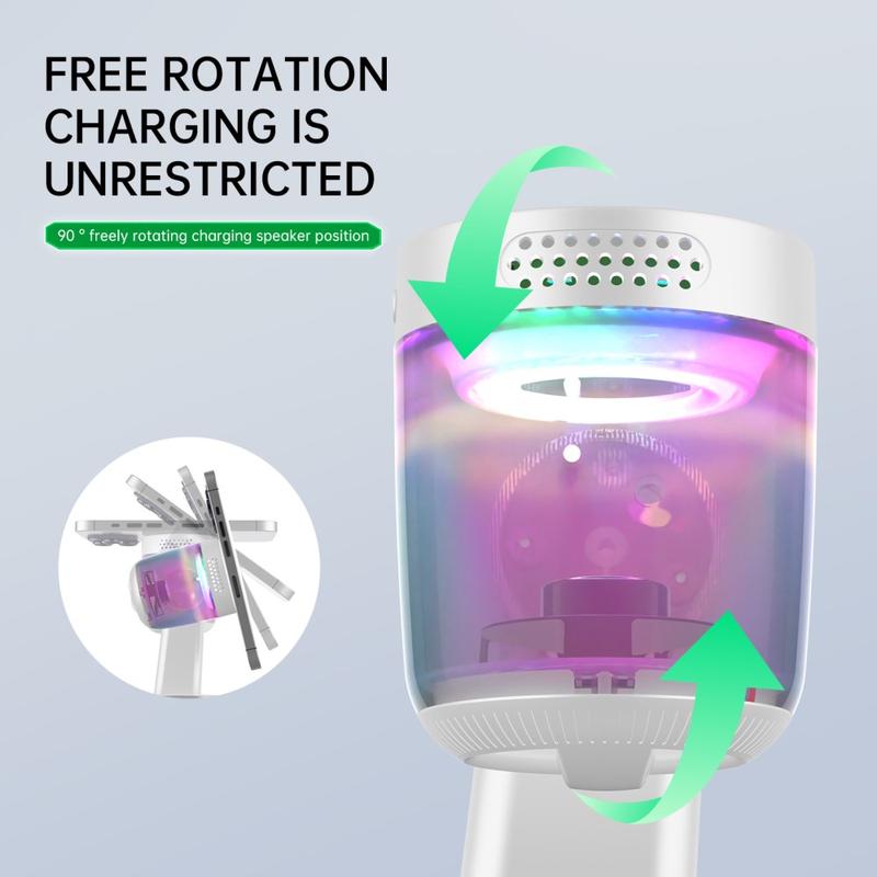 Med QI2.2 magnetisk trådløs ladestasjon slipper du kabelrotet og får strøm til alt du trenger på ett sted. Den er designet for moderne skrivebord og nattbord, og kombinerer en 25W magnetisk trådløs lader, Bluetooth-høyttaler og RGB-omgivelsesbelysning, noe som skaper den ultimate multifunksjonelle ladeløsningen for telefon, ørepropper og smartklokke.