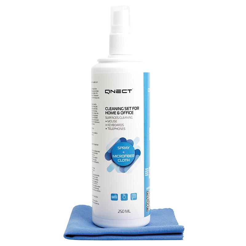- Qnect rengjøringssett kombinerer en myk klut og 250 ml desinfeksjonsspray