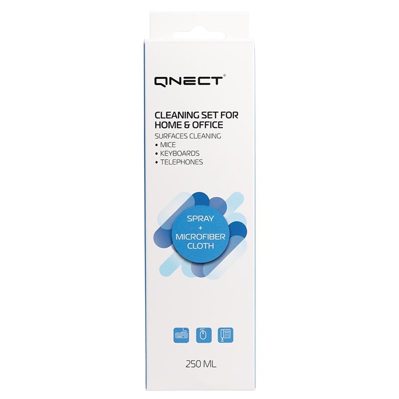 Enten du arbeider hjemmefra eller på kontoret, må du desinfisere skrivebordet, tastaturet, musen og andre ting regelmessig. Qnect antibakterielt rengjøringssett inneholder 250 ml desinfeksjonsspray og en mikrofiberklut.