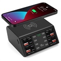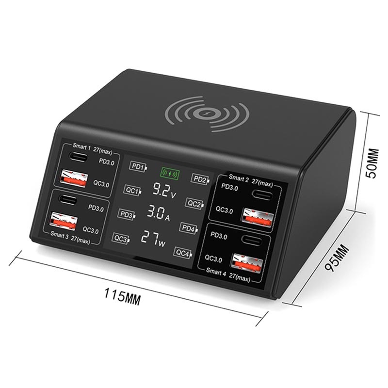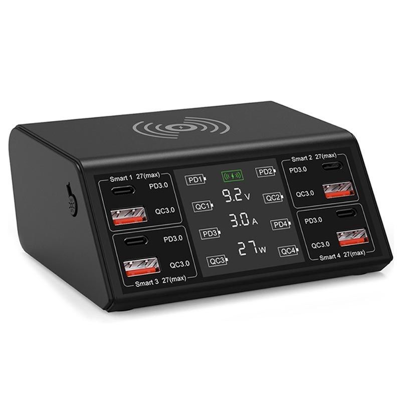 Denne ladestasjonen på 838 W har åtte hurtigladeporter, i tillegg til en 10-watts trådløs ladeplate.