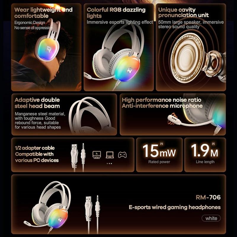 Remax RM-706 Over-ear hodetelefoner / spillhodetelefoner med mikrofon og fargerikt RGB-lys
