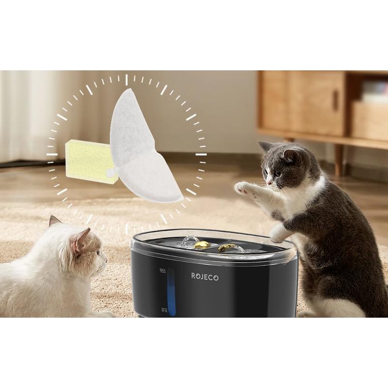Sørg for at kjæledyret ditt alltid har tilgang til sunt, rent og friskt vann. De medfølgende Rojeco-drikkefiltrene vil hjelpe deg med det! Det aktive karbon- og ionebytterharpiksfilteret eliminerer effektivt tungmetaller og forurensninger, mens svampfilteret fanger opp hår, pels og annet større avfall. Senk produktene ned i vann og rengjør dem før du bruker dem. For å sikre optimal filtreringsytelse må du huske å bytte filter minst en gang hver 2-4 uke - det er ikke noe problem å installere dem.