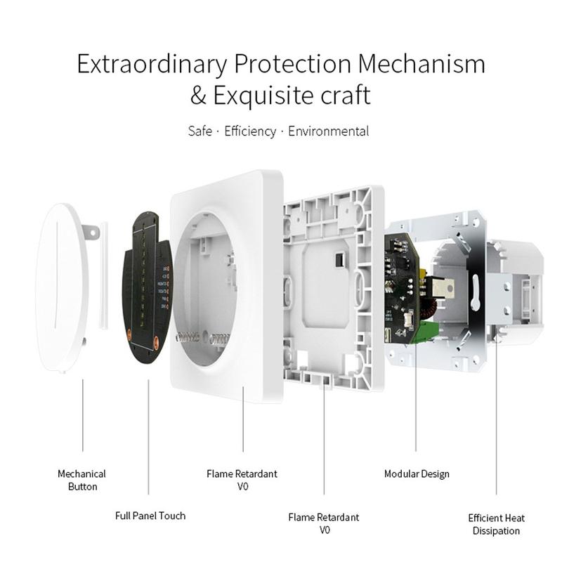 - Europeisk standardstørrelse - 86 x 86 x 43 mm-modulen passer til eksisterende veggbryterbokser for rask gjør-det-selv-ettermontering.