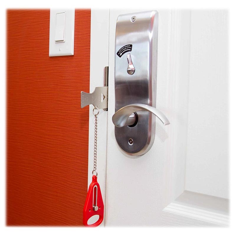 Sikre hjemmet ditt, eller bevar personvernet ditt hvis du er på et hotell, motell, leilighet eller andre steder. Dette produktet er utmerket for å stoppe og forhindre uønskede åpninger. Enkel å installere eller fjerne. Dørsikringen er laget av rustfritt stål, slik at døren ikke kan åpnes fra utsiden, heller ikke med nøkkel. Et robust ABS-plastdeksel er der for å forhindre skade på døren under trykk.