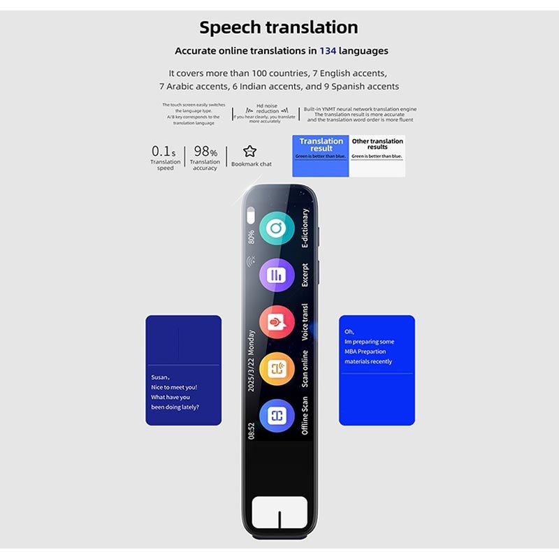 Fotooversettelse bruker optisk tegngjenkjenningsteknologi (OCR) til å skanne og umiddelbart oversette tekst fra bilder, noe som gjør det spesielt nyttig for å lese skilt, menyer eller dokumenter når du er på reise. Stemmeoversettelse på 134 språk gjør også S08B til en av de mest allsidige håndholdte oversetterne på markedet.