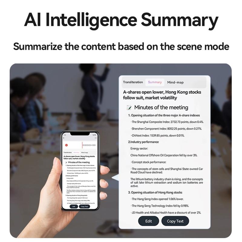 - AI-drevet transkripsjon: Koble til AIREC-APP-en via Bluetooth 5.3 for transkripsjon og oversettelse i sanntid på 188 språk, drevet av ChatGPT.