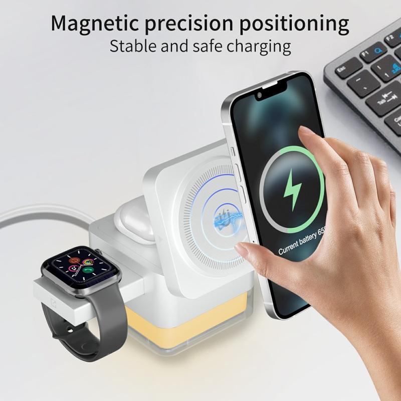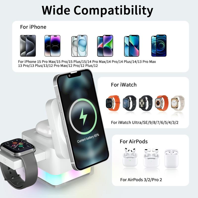Magnetisk justering hjelper med å holde kompatible enheter i riktig posisjon for stabil lading, mens den sammenleggbare designen gjør docken enkel å pakke ned i en veske eller ryggsekk. Den har også RGB-stemningsbelysning som gir et mykt, dekorativt lys og kan fungere som et mildt nattlys på et skrivebord eller nattbord.