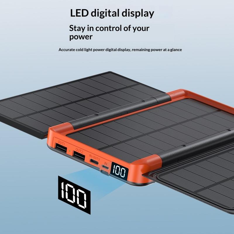 De sammenleggbare monokrystallinske solcellepanelene åpnes med et enkelt trykk, slik at du kan dra nytte av sollyset under utendørsaktiviteter. I tillegg til støtte for solcellelading tilbyr powerbanken flere kablede inngangs- og utgangsalternativer, noe som gjør det enkelt å lade et bredt spekter av enheter. Den digitale LED-skjermen lar deg sjekke batteristatusen tydeligere, mens den robuste konstruksjonen er designet for mer krevende daglig bruk utendørs.