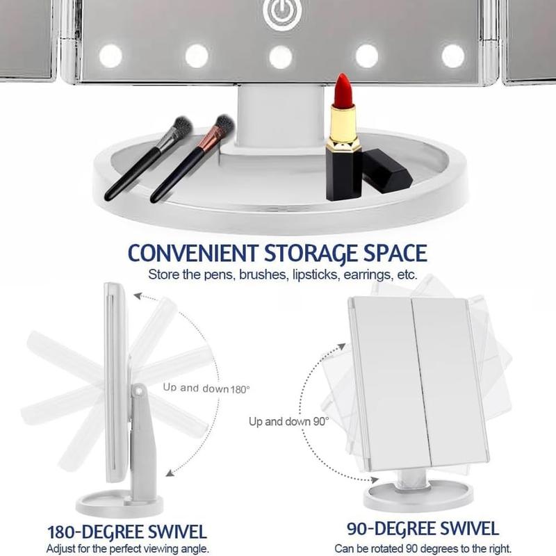 Det sammenleggbare LED-sminkespeilet med 3 sider kombinerer elegant design med praktiske funksjoner som justerbar lysstyrke og flere forstørrelser. Den kompakte, sammenleggbare formen gjør det både til et vakkert sminkespeil og et praktisk reisefølge.