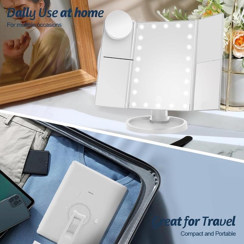 Sammenleggbart sminkespeil på 3 sider med 22 LED-lys - 1X/2X/3X/10X forstørrelsesspeil